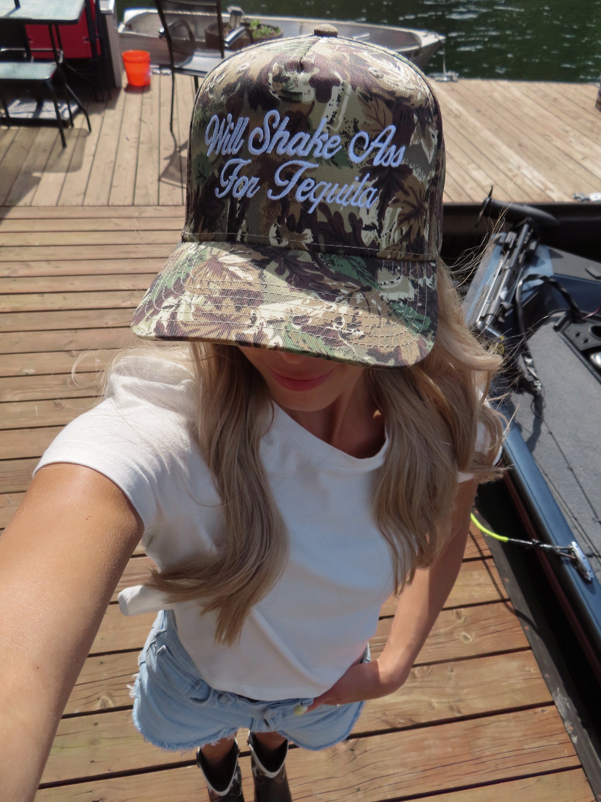 Ready to cause a scene this summer? Our "Will Shake Ass for Tequila" camo trucker hat is here to do the heavy lifting (and the heavy shaking). Whether you’re two-stepping at a country concert, floating down the river, or just aggressively vibing at a backyard BBQ, this hat is your ticket to instant legend status.